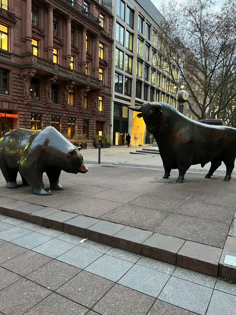 El Oso y el Toro es una escultura situada en el centro financiero de Frankfurt y representa el mundo de la bolsa: el toro simboliza los mercados al alza y el oso los mercados a la baja.